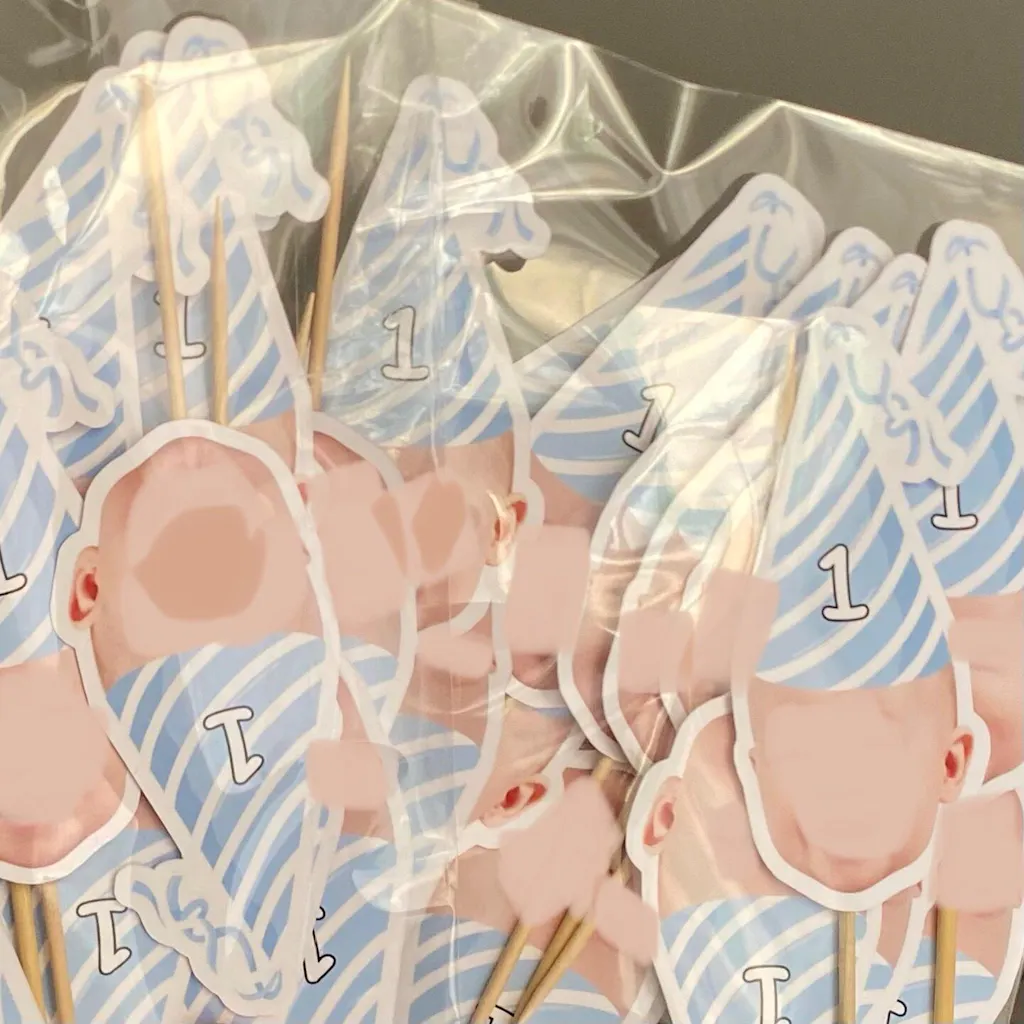 Personalized face cake topper, blue birthday hat.